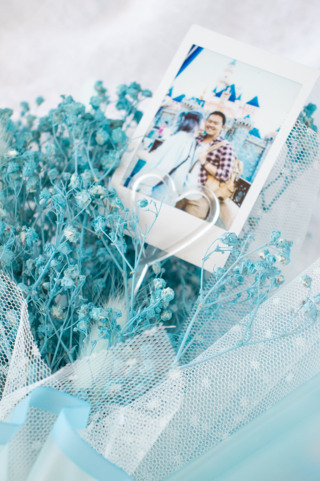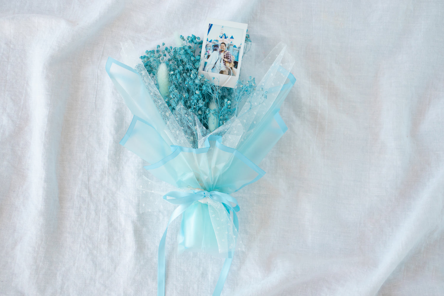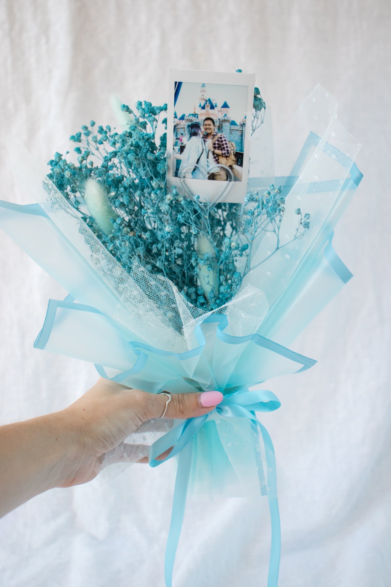 Petite Custom Photo Bouquet - Dried Blue Baby’s Breath + Aqua Wrap