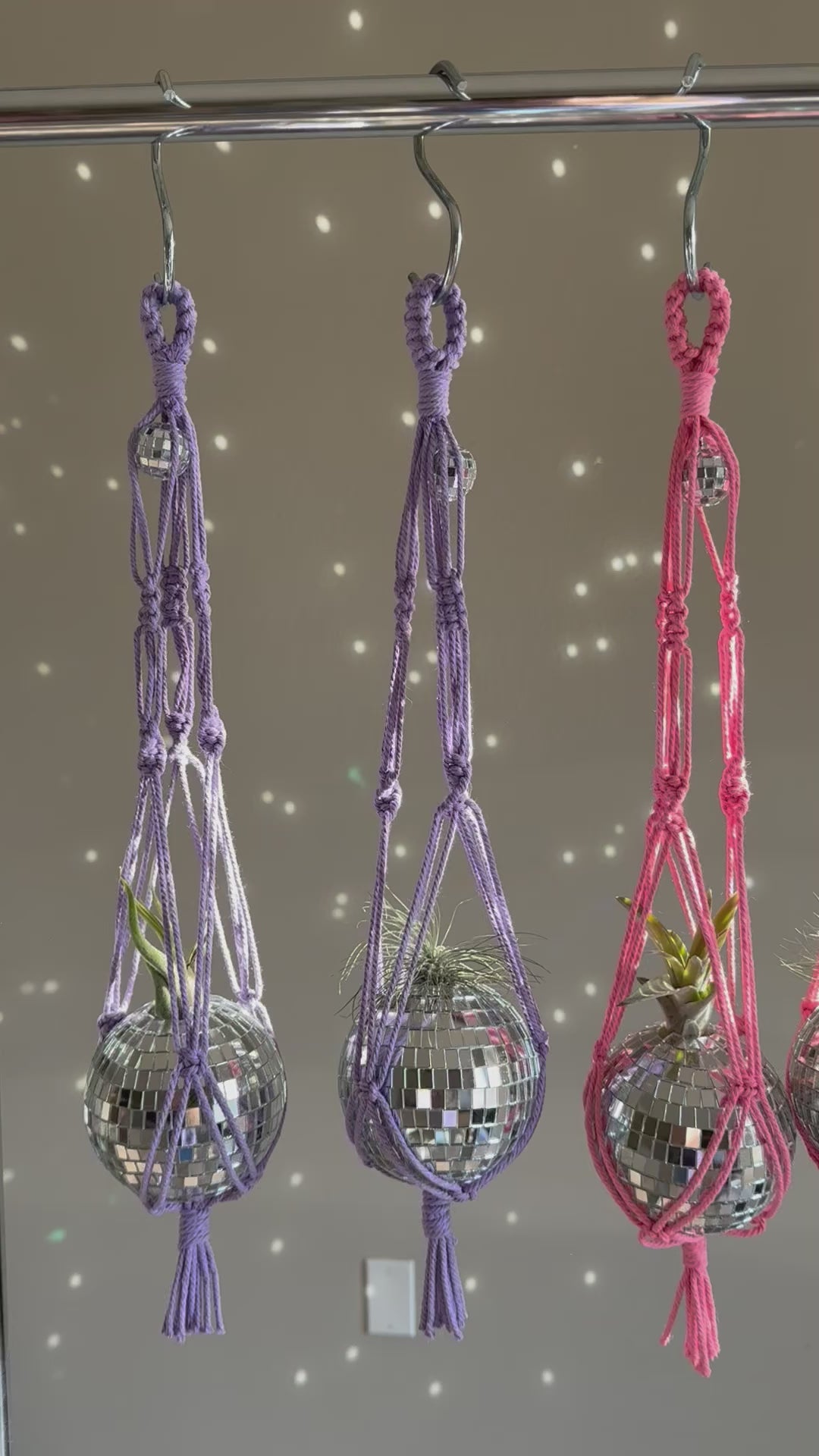 Add some sparkle vibes and fun to your space with our handmade macrame disco ball planters. Hang by a window to create a gorgeous light effect. Each is hand-tied with 100% cotton cord.