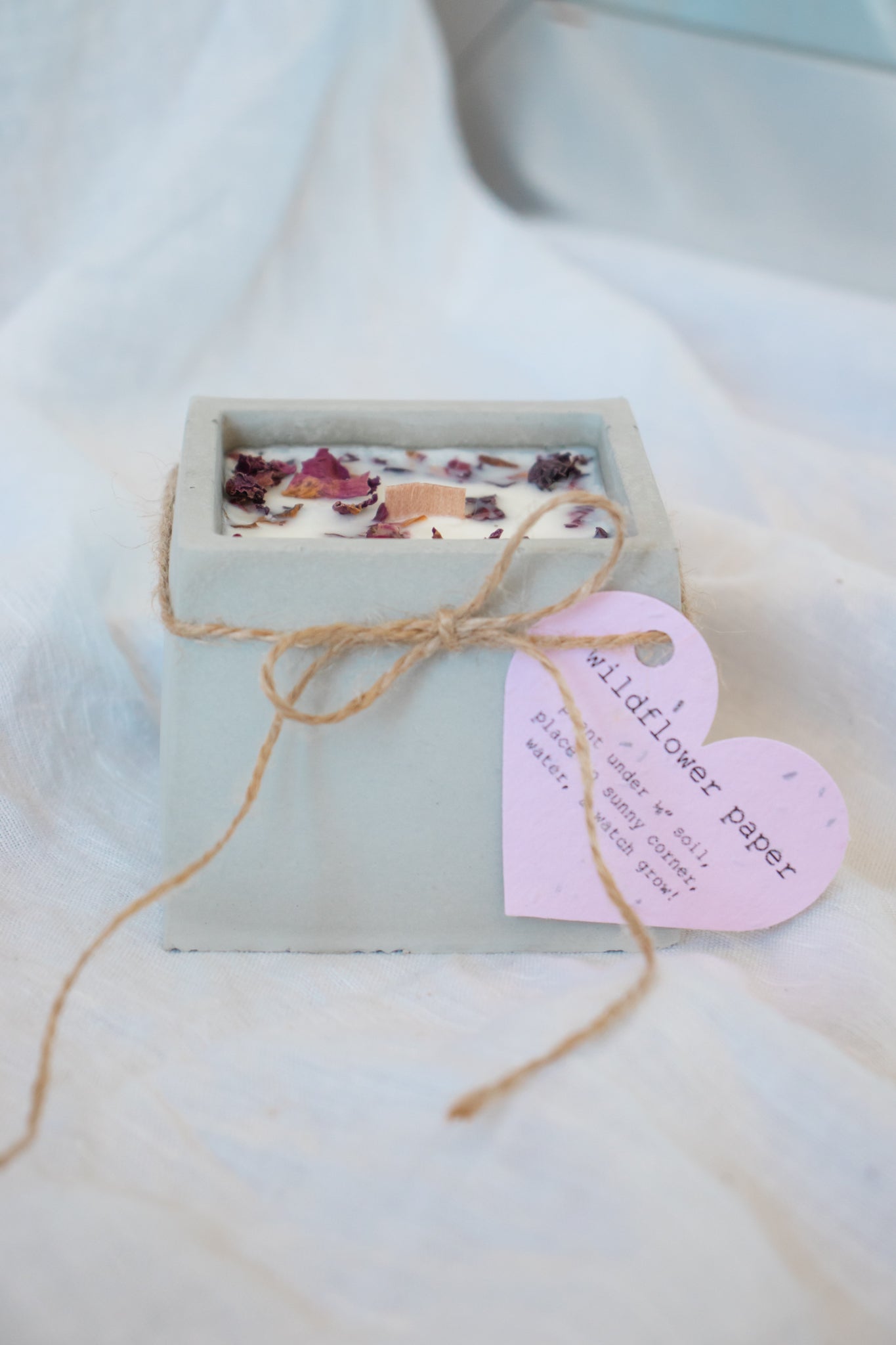 Practice sustainability without compromising your mid-century modern aesthetic via our dual-purpose, handcrafted soy wax candle housed in our classic concrete plant pot - created to eliminate single use candle jar waste. This candle will first infuse your space with the familiar sweet airy scents of fresh roses before the vessel can be transformed into a growing space for blooming wildflowers, using the seed paper included. Featuring dried rose petals and a wooden wick to add to your aromatherapy experience. Additional colors and styles are available in this collection.
